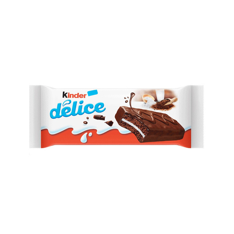 Kinder Délice, met z'n heerlijk cacaolaag, die twee stukjes zachte cake bedekt met een romige, melkachtige vulling.