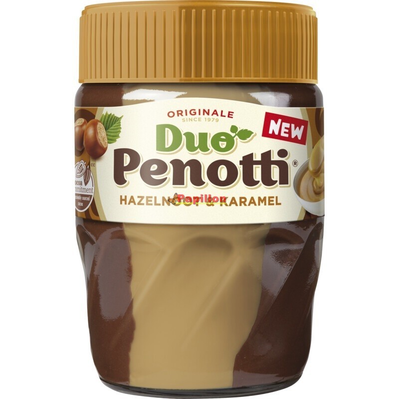 Overheerlijke hazelnootpasta gecombineerd . Met intens romige karamelpasta. Dubbel lekker! Zonder kleurstof en conserveermiddel. Cacao van rainforest alliance gecertificeerde boerderijen. Met cocoa commitment kiest Penotti voor duurzaam geteelde cacao.