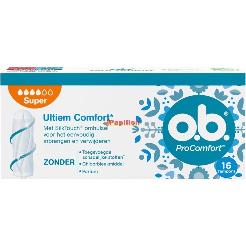 O.B. Pro Comfort Super Tampons zorgen voor ultiem comfort en betrouwbare bescherming. De tampons zijn het meest geschikt voor normale tot zware dagen. Dynamic Fit technologie met 3D-expansie past zich na het inbrengen aan je lichaam aan en helpt de opgevangen vloeistof efficiënt naar boven te leiden via de aaneengesloten groeven. Met SilkTouch huls voor comfortabel inbrengen.